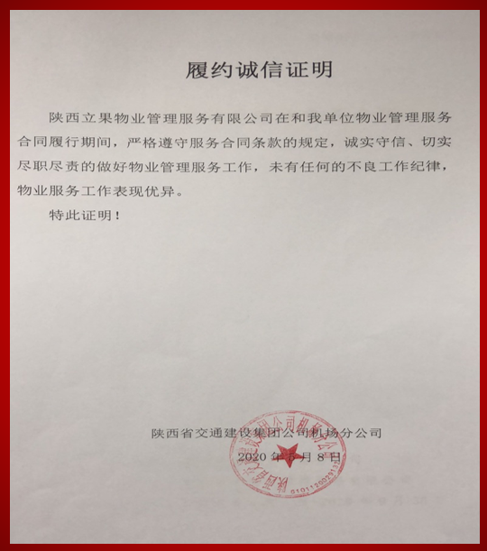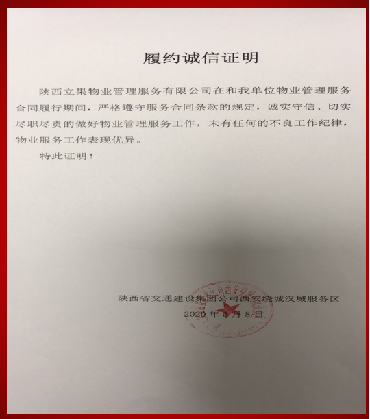 陕西立果物业管理服务有限公司 客户荣誉类